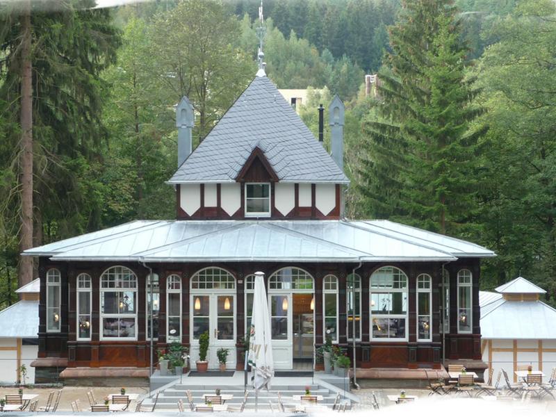 Die denkmalgeschützte Außenanlage des Restaurant & Café Waldquelle im Bereich des Waldparkes.