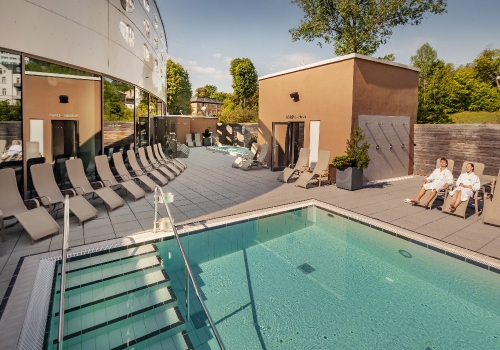 Moderne und lichtdurchflutete Bade- und Saunalandschaften mit beheizten Innen- und Außenschwimmbecken