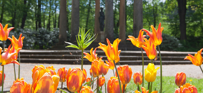 Idyllisch an der Südseite des Louisa-Sees gelegen, schmiegt sich der Floratempel hinein in die wunderschöne Natur der Kurparkanlage. Hohe Bäume überragen sein rundes Kuppeldach, das auf steinernen, ionischen Säulen ruht. Davor breitet sich eine Wiese aus, auf der sich abhängig von der Jahreszeit passenderweise bunte Reihen von Blumen im Wind wiegen. Und selbstverständlich darf sie nicht fehlen: Flora. Im ewigen Schatten der Kuppel steht ihr gegossenes Abbild und blickt voll Wohlwollen über den See. Das gesamte Konstrukt strahlt ein typisch römisches Flair aus, das romantischer kaum sein könnte.
