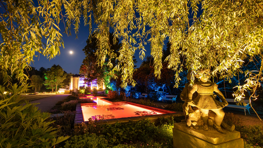Besondere Parkbereiche und Architekturschätze werden je nach Jahreszeit unterschiedlich kunstvoll mit außergewöhnlichen Lichtelementen inszeniert. Von einsetzender Dämmerung bis Mitternacht.